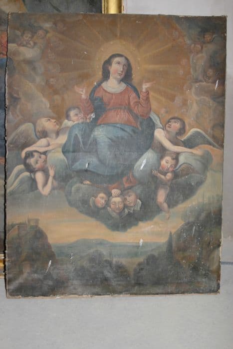 calcaire : taillé ; toile (support) : peinture à l'huile