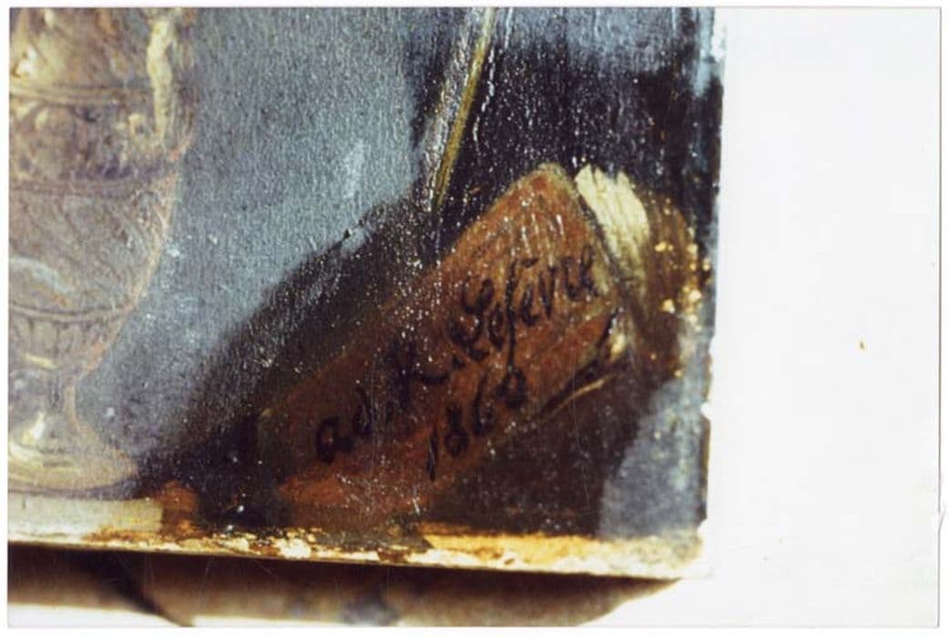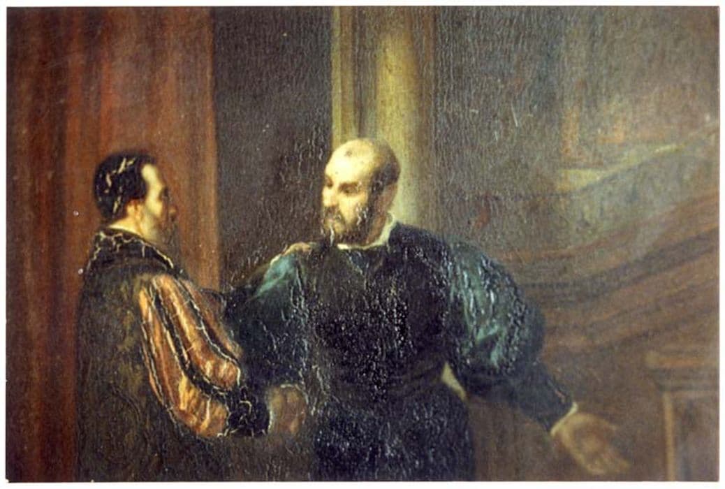 Au centre, un peintre présente à son commanditaire la toile qu'il vient d'achever. Chauve, il porte barbe et moustaches. Il est vêtu d'un habit noir à manches bouffantes bleu outre mer. Le commanditaire est vêtu d'un long manteau et serre la main de l'artiste. Sur le côté droit deux aides attendent appuyés contre une table chargée de hanaps. Sur le côté gauche, un groupe de courtisans, certains assis, d'autres debout, admirent l'oeuvre. Au fond, on distingue le bas d'une rampe d'escalier et une porte monumentale encadrée par des colonnes et surmontée d'un fronton interrompu. Le carrelage blanc et noir dessine des losanges. Le tableau a aussi pu être identifié comme représentant Le Corrège présentant un tableau à Michel-Ange.