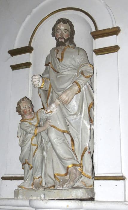 Groupe en terre cuite représentant saint Joseph et l'Enfant Jésus. L'homme et l'enfant sont représentés en mouvement. Ils ont été saisis "en marche". L'enfant joufflu montre une expression joyeuse et semble à la fois s'appuyer sur son père de la main droite et le guider de la main gauche. Le mouvement des cors entraînant les plis des vêtements. Saint Joseph est particulièrement animé, la jambe droite, passée devant la gauche, ne repose au sol que par le bout du pied. Le traitement du nez, du front et de la pilosité est très proche de la statue du saint évêque, les plis du visage de Joseph marquant un léger sourire. L'expression générale est cependant troublée par la mise en peinture actuelle. Là aussi on distingue de nombreuses traces de la polychromie d'origine : si le vêtement près du corps de Joseph semble de couleur claire, son manteau drapé était rouge alors que celui de l'Enfant était bleu.