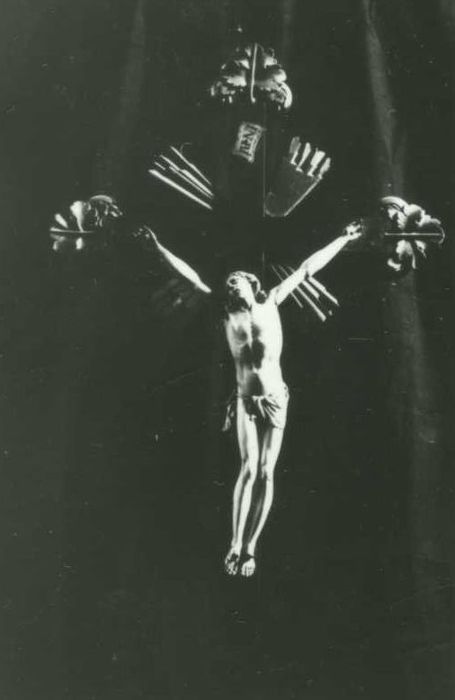 La croix est en bois peint en noir avec ornements dorés aux extrémités des bras. Christ en ivoire.