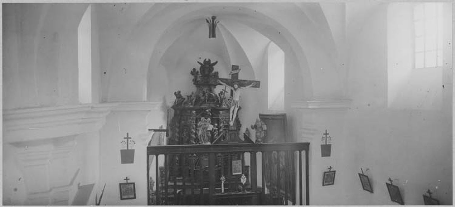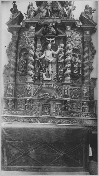 inscription et date à la base du retable : ANNO 1673 AD MAIOREM JESV GLORIAM HOC OPVS FECIT FIERI MARTINVS MONTMEYEVR RESCVRATVS MEI SVCCESSORES BENEVOLI ORATE PROME PECCATORE MISERERO QVI MODO HOC SOLVM SVPER EST SEPVLCHRVM.