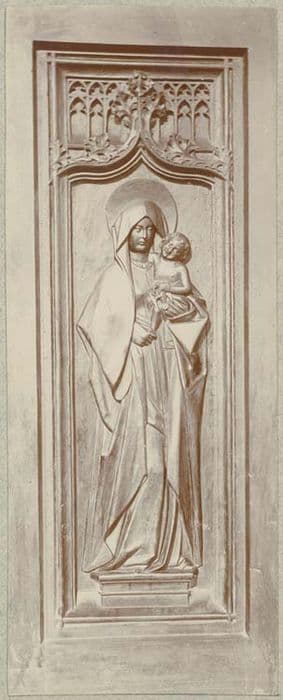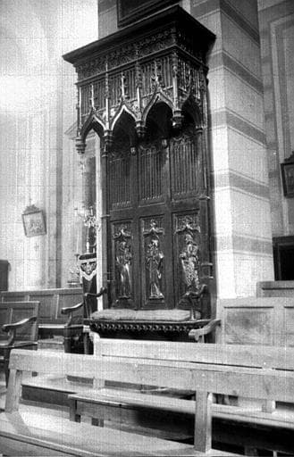 Structure à haut dossier avec dais, monté sur estrade à deux emmarchements ; banc à accoudoir. Trois panneaux verticaux en bas-relief en dosseret.
