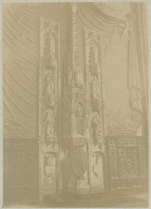Le tabernacle, de forme pyramidale, est accompagné à droite et à gauche de deux séries superposées de niches qui abritent les quatre évangélistes.