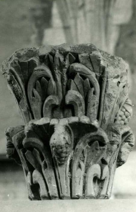 Chapiteau à feuillages scellé sur un bloc de pierre et recouvert de peinture grise.