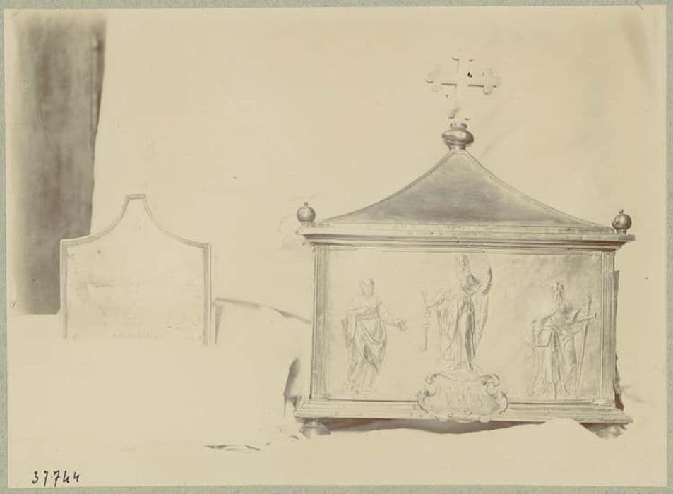 Coffret rectangulaire dont le toit à quatre pans est surmonté d'une croix de Saint-Maurice.
