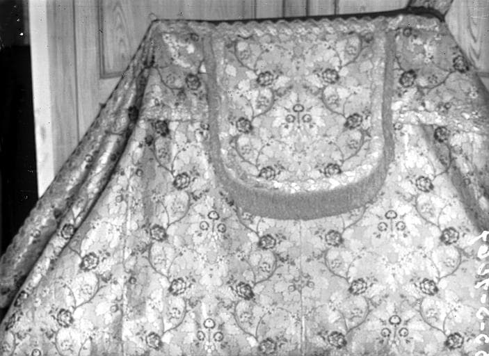 Tissée d'or et d'argent. Les galons sont d'or et le chaperon est frangé d'or.