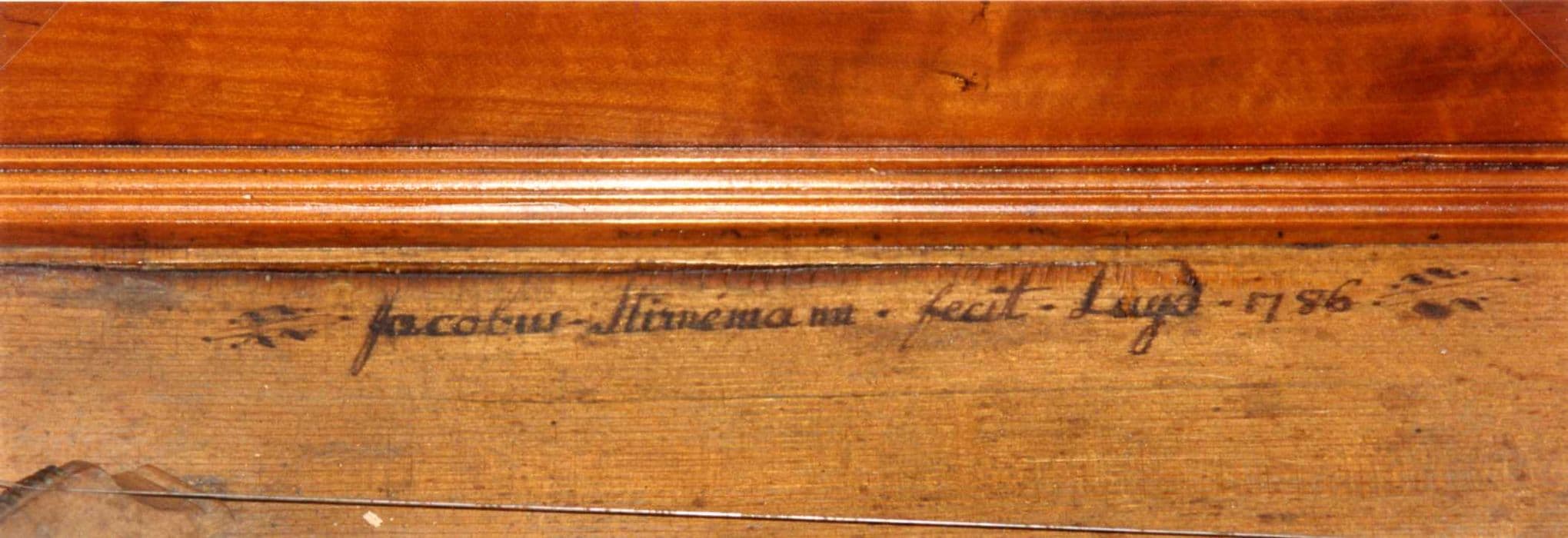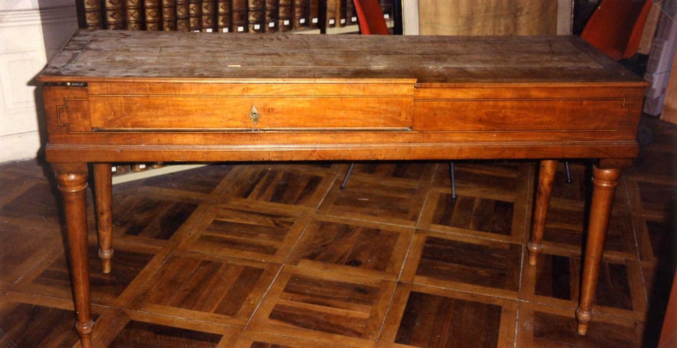 Rare piano forte carré, mécanique à simple pilote, tessiture fa à fa, 5 octaves, 61 notes, deux jeux de forte, jeu de luth.La caisse du piano, en merisier avec incrustation de filets de buis et d'ébène, est en très bon état. La table d'harmonie en épicéa présente un léger affaissement, dû à la tension des cordes, qui ne pose aucune inquiétude. Caractéristique de cette époque, le facteur a signé directement à l'encre sur la table. Le clavier de 5 octaves (fa à fa) est de style inversé (note naturelle en ébène et feintes en bois noirci recouvert d'os). La mécanique est en assez bon état. Il ne manque aucun marteau ni aucun étouffoir. Seul la garniture de la barre de repos des étouffoirs est altérée. Les cordes ont subi plusieurs réparations mais la majorité des cordes en fer sont originales. Les manettes des jeux de luthe et de forte sont modérément oxydées, les boutons de tirages sont en laiton.