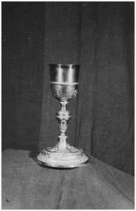 Calice en argent (pied) et argent doré (coupe), monté sur tige filetée interrompue par un noeud. Coupe lisse à fausse coupe ornée.