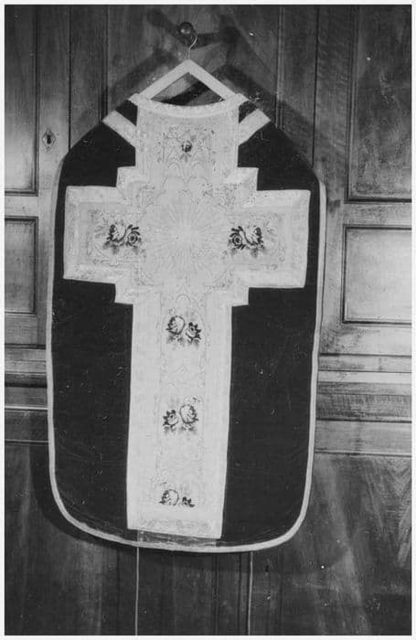 Fond : velours de soie rouge.Doublure : satin de soie rouge.Orfroi au dos : lampas tissé à disposition, soie polychrome, fils de soie blanche, filés argent.Colletin de coton blanc chantourné.Galon : filé or