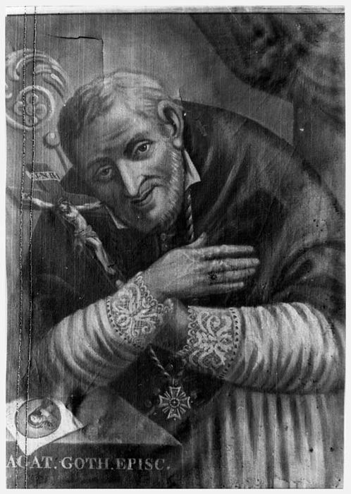 Signature (au dos) : Taravel ; inscription (sur le prie-Dieu) : Agat.Goth.Episc.