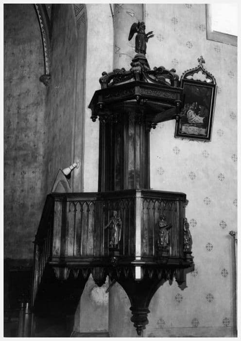 Chaire néo-gothique décorée d'arcatures et de statuettes.