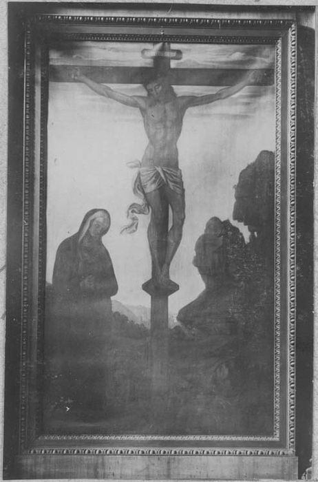 Arrêté : Le Christ en croix, toile, "copie du panneau central d'un triptyque de la fin du XVe siècle, dont l'original appartient au Musée de l'Ermitage, milieu 19e siècle" (mention manuscrite).