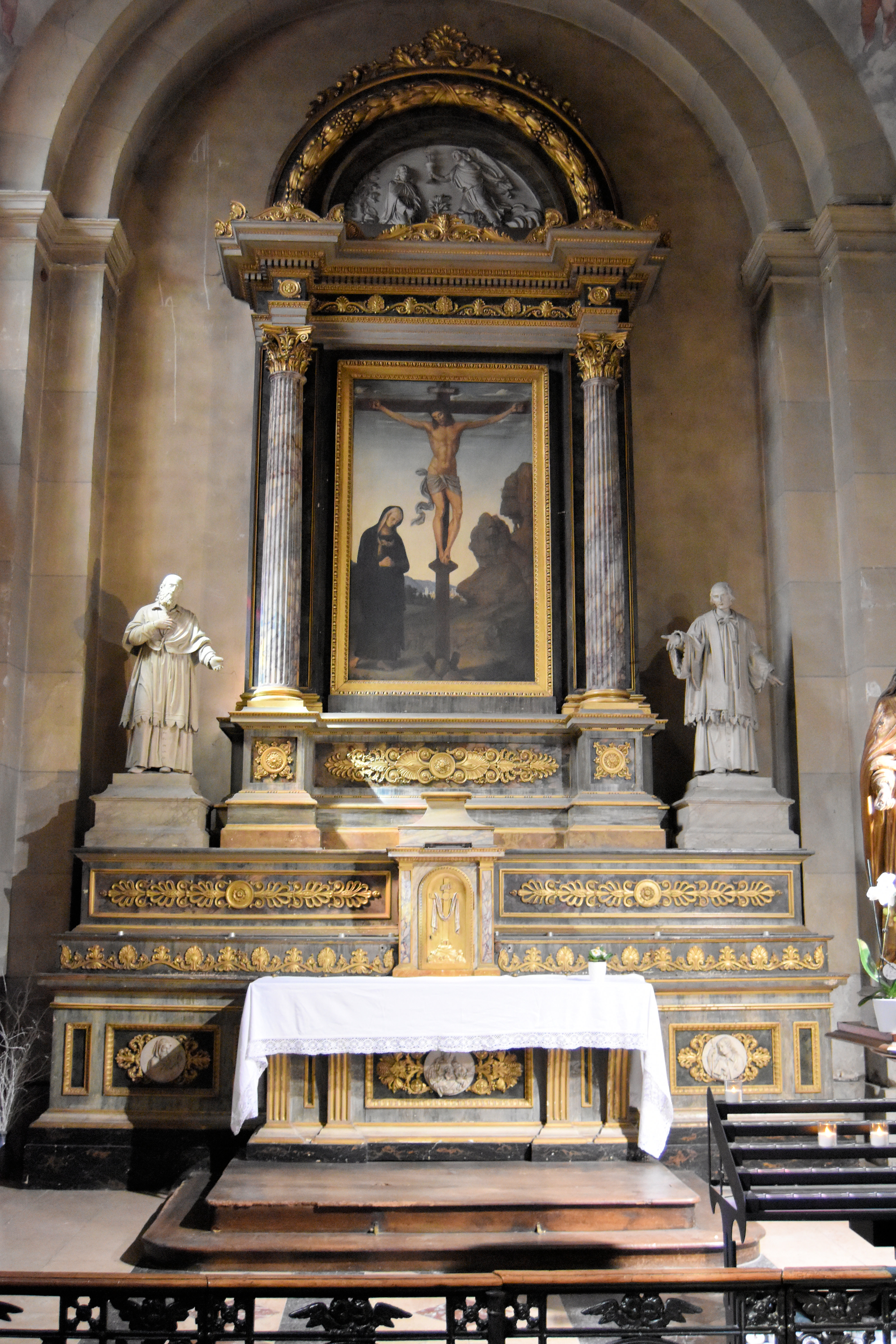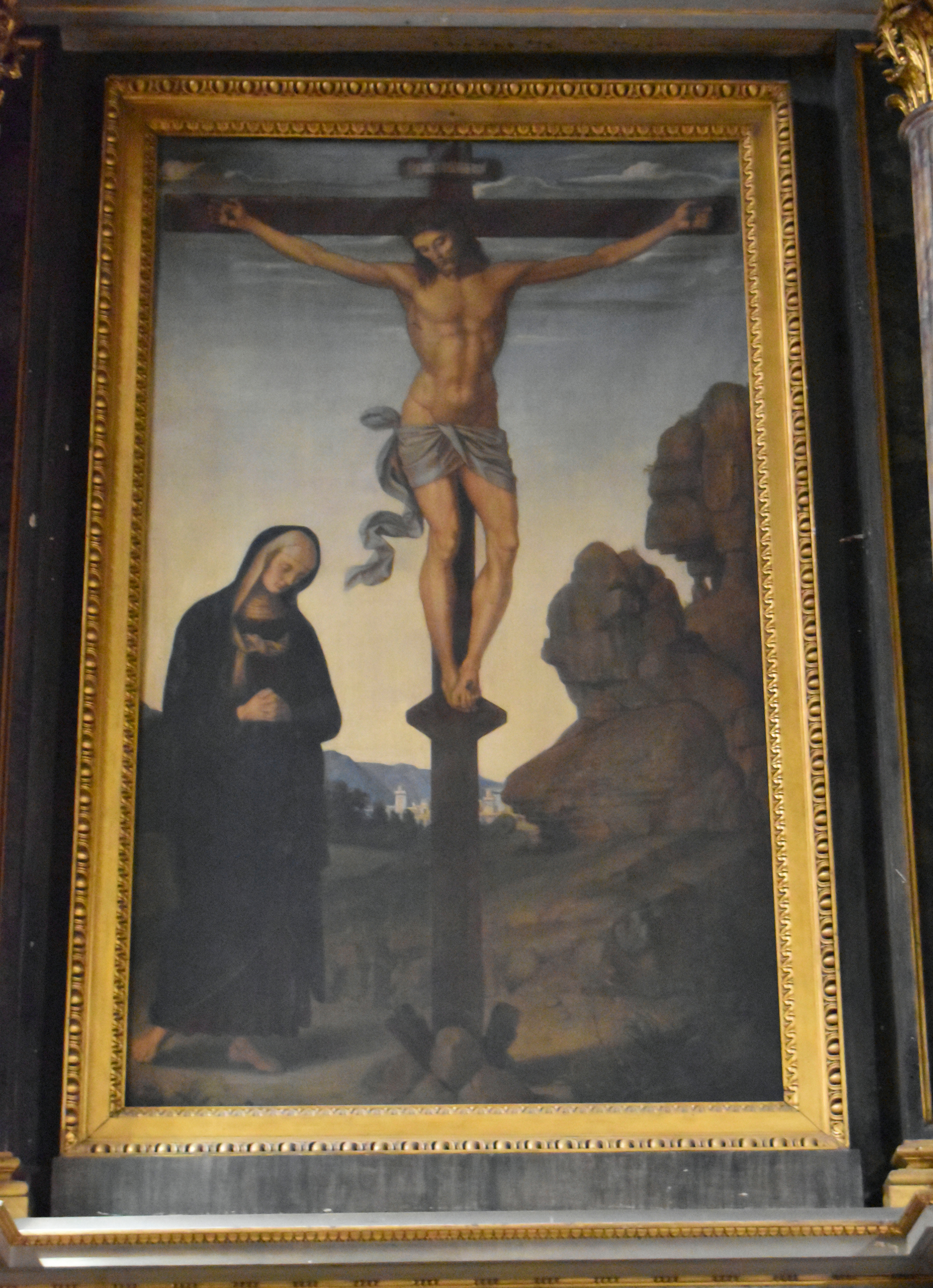 Le tableau, ainsi que celui du Rosaire ont été offerts à l'église par monseigneur Dupanloup, originaire de Savoie, qui les envoie de Rome en 1857. Ils ont été exécutés par le peintre d'histoire Antoine Sublet, né à Lyon et mort en 1897. La Crucifixion d'Annecy est une copie d'après un triptyque du Pérugin conservé aujourd'hui au Musée de l'Ermitage à Saint-Pétersbourg mais qui était encore à Rome où Sublet a pu le voir au 19e siècle. La similitude est complète entre les deux œuvres : la Vierge et le Christ ont la même attitude, le drapé du périzonium s'envole d'une manière identique. Curieusement la figure de saint Jean qui est à gauche de la croix dans le tableau de l'Ermitage a été supprimée dans l'œuvre d'Annecy. Mais le rocher qui la remplace est repris dans tous les détails formels sur le modèle du Pérugin, où il occupe le volet droit du triptyque.