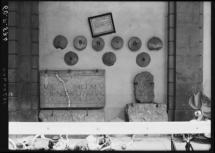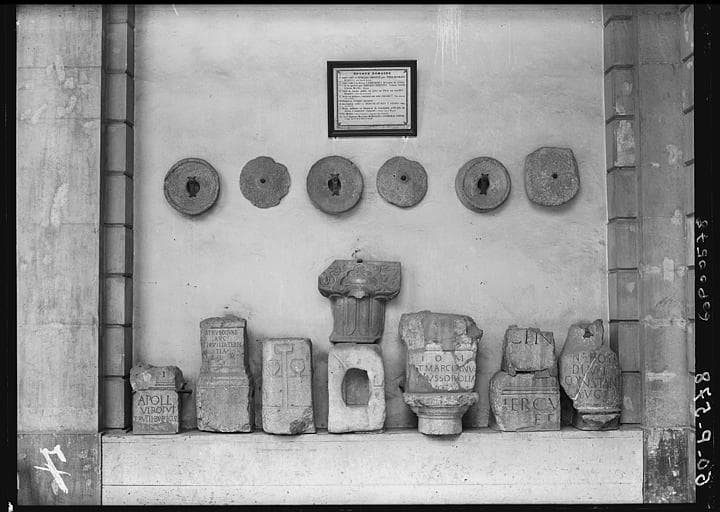 Partie inférieure d'une colonne en calcaire, transformée en borne milliaire, gravée d'un texte. Texte actuellement conservé de quatre lignes. Le texte a été martelé avant NEPOTI. Le nom de l'empereur a été martelé.