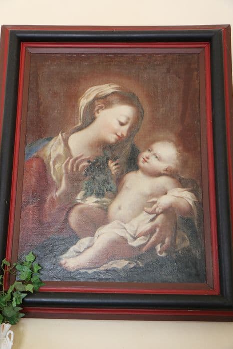 La Vierge est représentée en buste. L'Enfant est simplement vêtu d'un linge de pudeur. Sa mère se penche vers lui et lui tend une grappe de raisin.