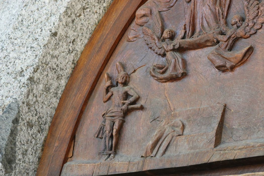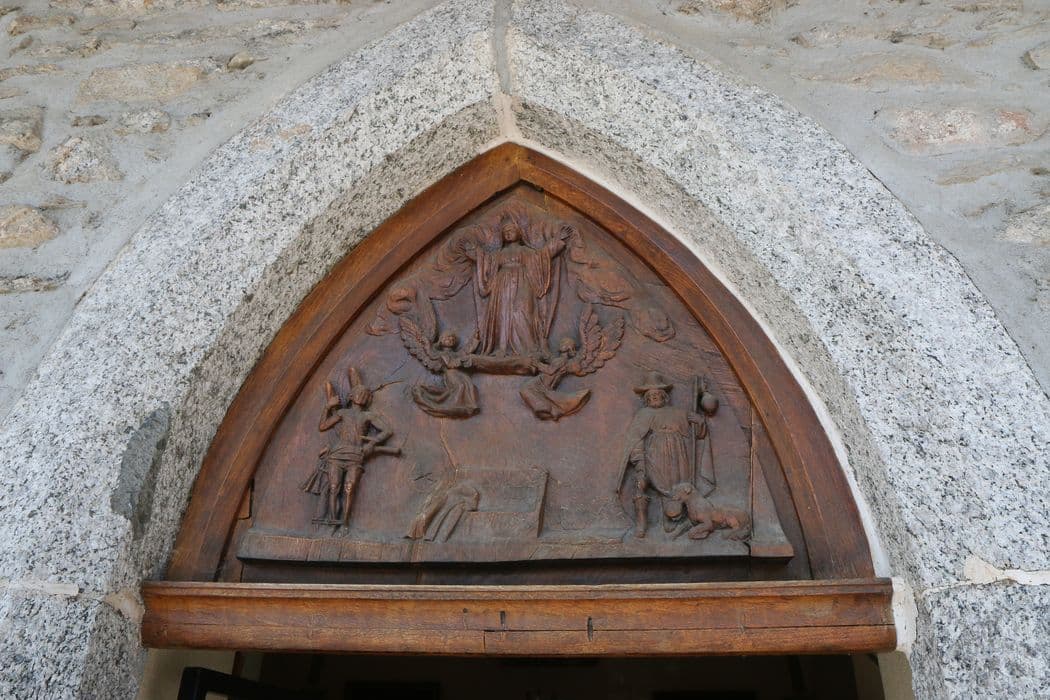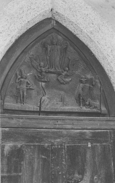 Bas-relief représentant l'Assomption de la Vierge, élevée dans les cieux par deux anges dans la partie supérieure. Entourant son tombeau vide dans la partie inférieure, figurent saint Sébastien à senestre et saint Roch à dextre.