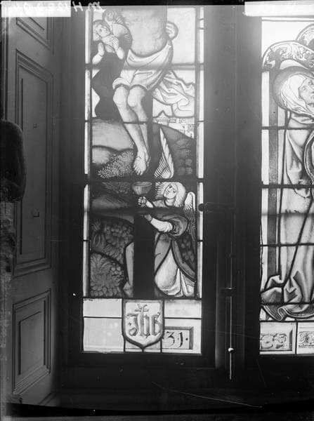 h = 128 ; la = 46 ; Dimensions de troix vitraux ; vitrail saint Sébastien : h = 46, la = 68