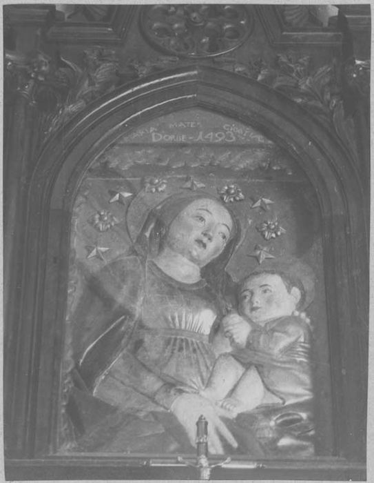 Dans la partie supérieure de l'ogive on lit : MARIA MATER GRATIAE D'ORBE 1493.