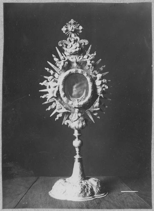 Oeuvre volée entre 1970 et 1980 (lors du dernier récolement, effectué en 2012, il n'a pas été possible de voir cet ostensoir ; la dernière fois que celui-ci a été vu remonte au début des années 1980).