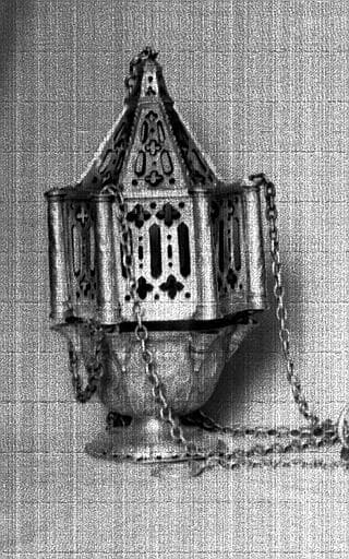 Le pied cylindrique dont le bord est orné de feuilles stylisées, soutient l'encensoir dont la base est à six faces ornés alternativement de rinceaux et de médaillons. De l'arête de chaque angle, s'élève une console soutenant une colonne. Les six colonnes supportent le couvercle en forme de pyramide hexagonale ajouré de quadrilobes et de trèfles. Une inscription court sur le bord du fût hexagonal. Le couvercle est du XVIe siècle mais la partie inférieure de l'encensoir portant un décor de cartouches et de coquilles date du XVIIIe siècle.