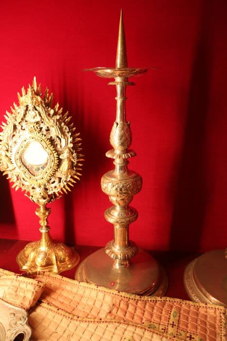 Le pied des deux chandeliers est décoré de guirlandes et de trois médaillons portant l'inscription. Le fût est de forme complexe. Le nœud central est orné de fleurs et de têtes d'angelots ailées.