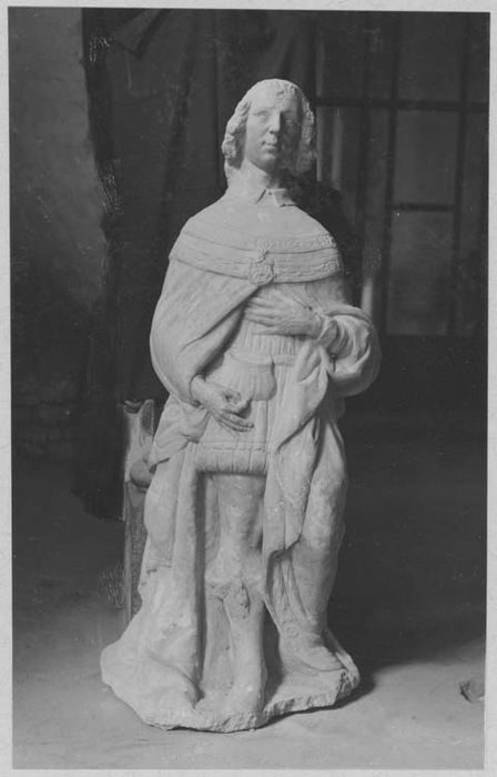 On relève un éclat et une lacune au niveau du pied droit de la statue et du drapé du manteau, sur le socle.