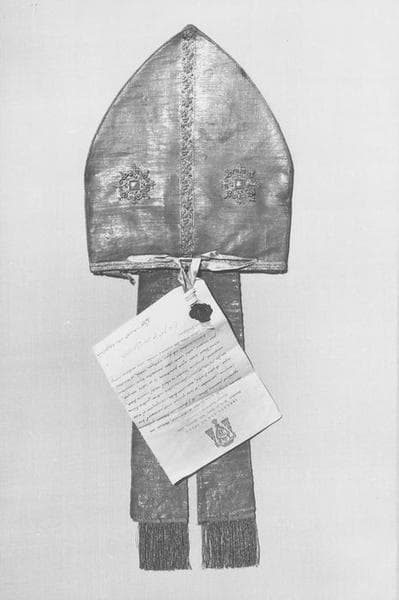 Une mitre brodée de deux médaillons ayant appartenu à saint François de Sales et deux mitres qui ont dû appartenir à Charles Auguste de Sales, neveu et successeur de saint François de Sales.
