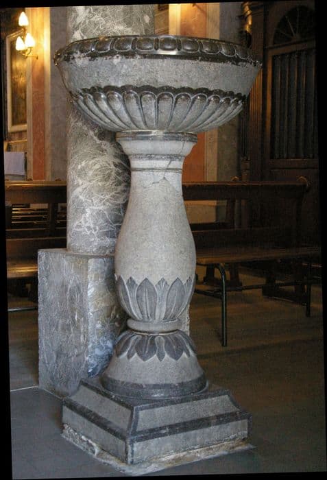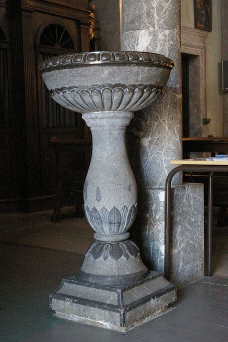 Les bénitiers sont placés sur un socle quadrangulaire. Le fût est renflé dans la partie inférieure et décoré d'un motif de palmettes. La cuve est ornée de godrons.