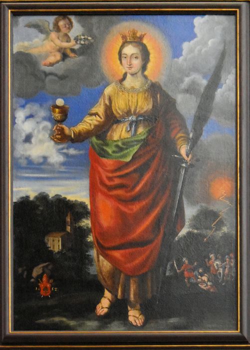 La sainte est debout, couronnée et nimbée. Elle est vêtue d'une longue robe finement plissée et serrée à la taille par une ceinture, recouverte d'un long drapé rouge. Elle est chaussée de sandales. Dans la main gauche elle tient la palme des martyres et l'épée. Dans la main droite elle présente le calice surmonté d'une hostie. Dans le ciel, à gauche, un ange lui apporte une courone de feuilles et de fleurs. Le bas du tableau est occupé par trois figurations différentes. En bas à droite se déroule la scène du martyre : la sainte est décapitée par ses bourreaux. Un personnage agenouillé reccueille son sang dans un bassin. Un haut personnage à cheval accompagné de trois serviteurs assiste à la scène. Quant au bourreau qui tient encore son épée à la main il va être foudroyé par un éclair qui jaillit du ciel. Devant une forêt se dresse une petite église, sans doute la chapelle à laquelle ce tableau était destiné à l'origine et qui devait se trouver sous le patronage de la sainte.