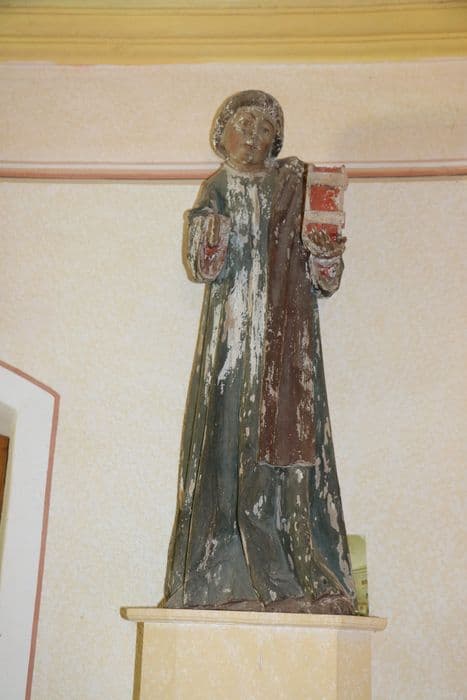 Habillé des vêtements de prêtrise, le jeune homme a les cheveux mi-longs et ondulés. Il tient un imposant livre dans sa main gauche, les évangiles probablement. Sa main droite est repliée sur sa poitrine.