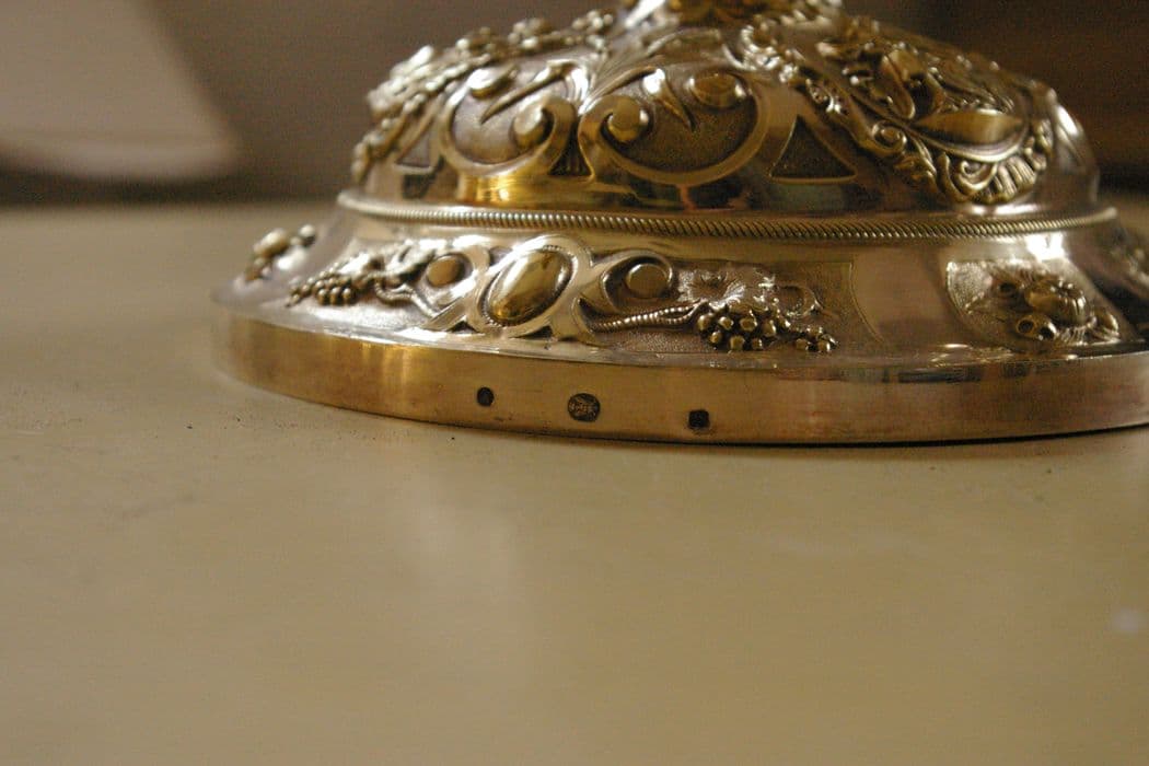 La coupe du calice est en argent et le pied en métal blanc. Le pied est orné d'un décor végétal incisé.