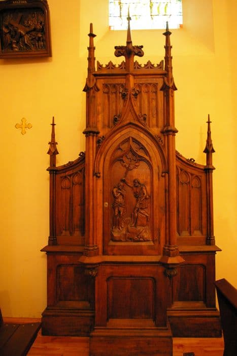 Au centre de l'édicule néo-gothique figure un bas-relief. Le fond du relief est nu.