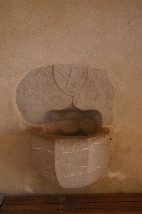 Simple cuve creusée dans le mur du porche sous un arc en anse de panier, le bénitier est surmonté d'un écusson dans lequel figure la croix de saint André.