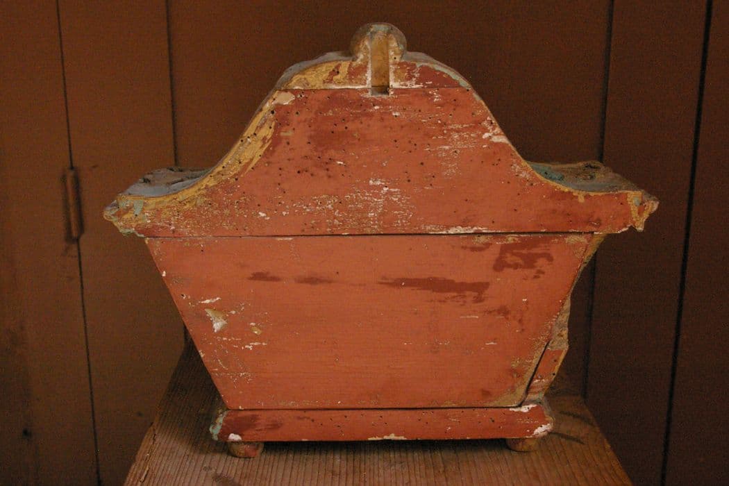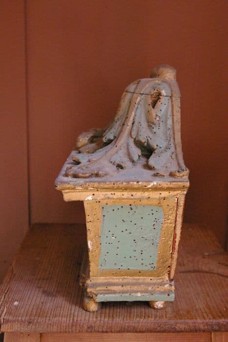 Le reliquaire a la forme d'un coffret trapézoïdal à base rectangulaire reposant sur quatre pieds en boule. Il est recouvert d'une sorte de couvercle décoré d'une large feuille bombée au centre. Les reliques sont visibles par une fenêtre vitrée percée latéralement et dont le bord est décoré de perles.