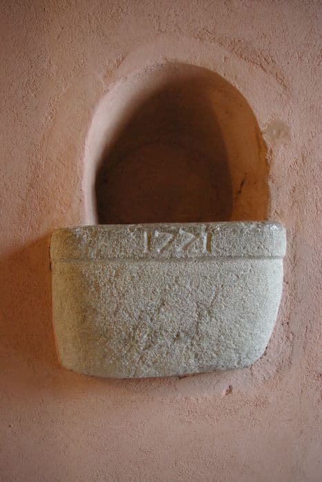 Le bénitier ne porte comme décor que la large moulure sur laquelle se lit la date.