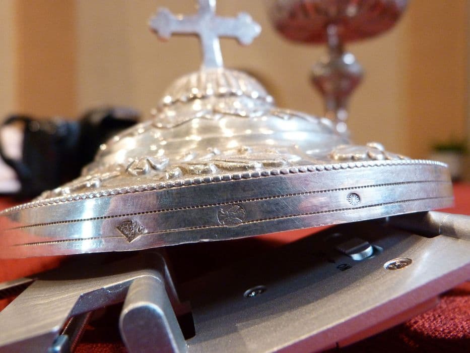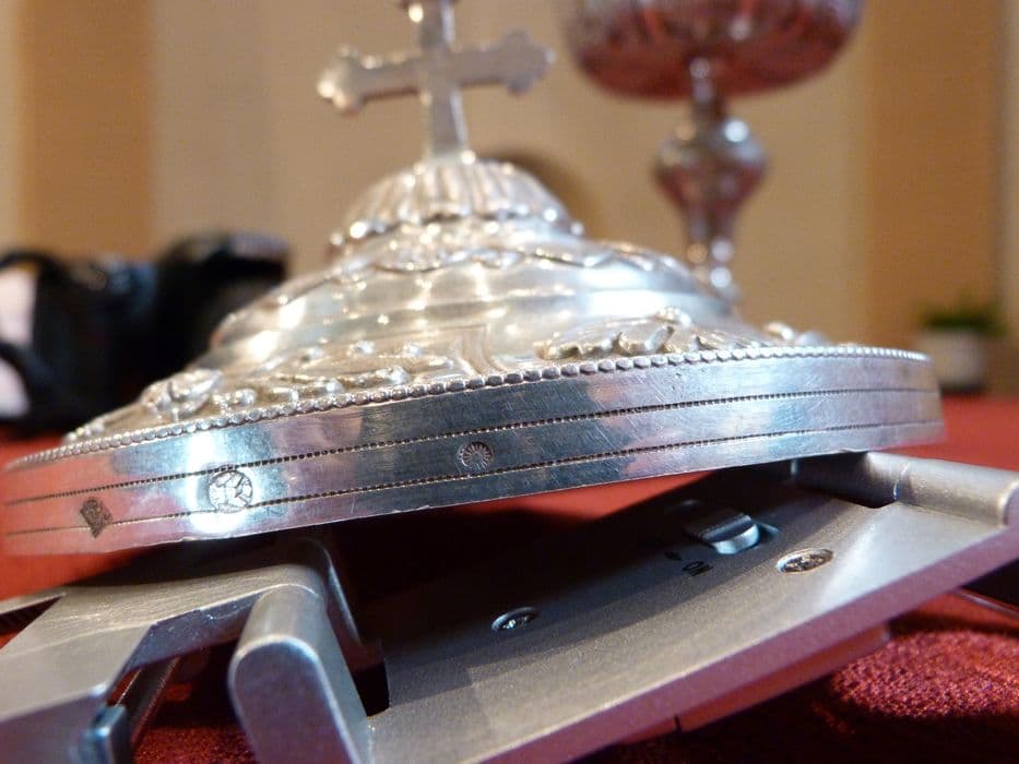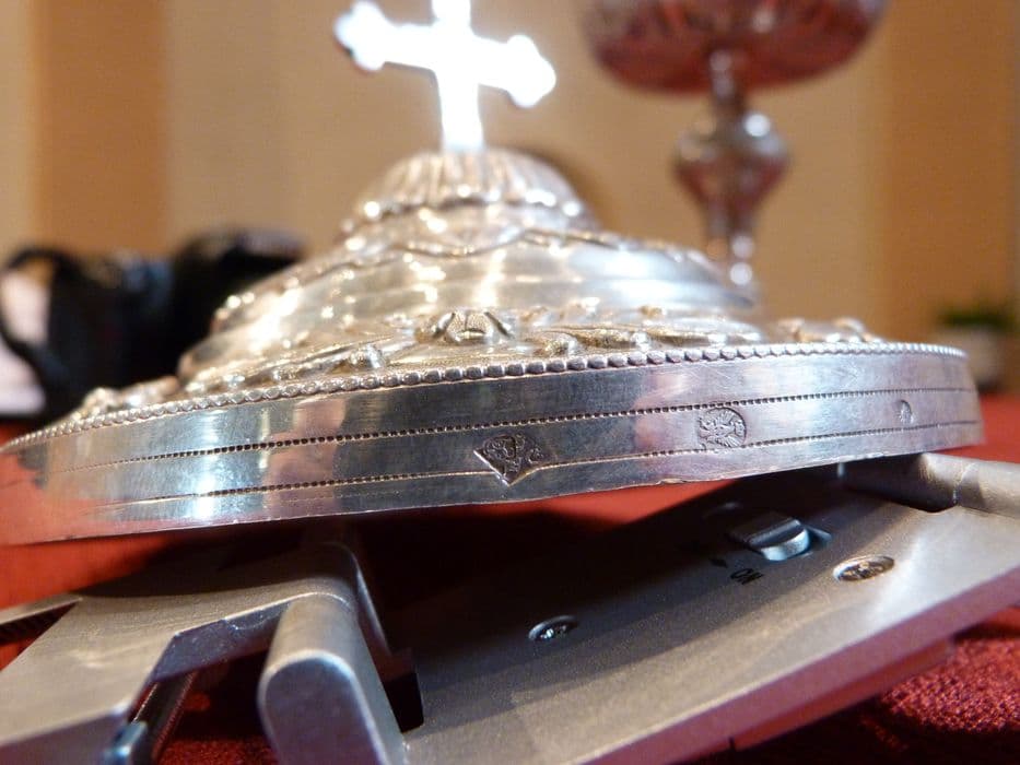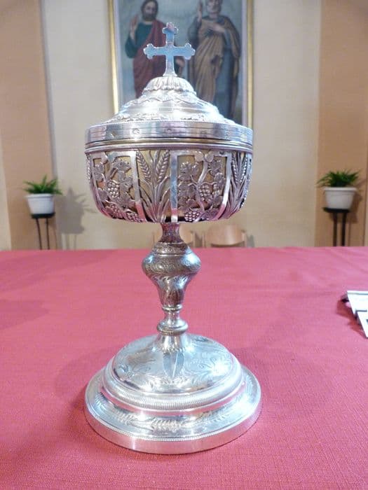 La coupe du ciboire est décorée d'un relief ajouré représentant la vigne et le blé. Plus sobre la décoration du pied est simplement ajourée et présente des épis de blé et des fleurs stylisées.