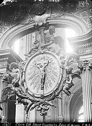 Le banc d'oeuvre a été exécuté par Pierre Lepautre (1660-1744), d'après les dessins de Sylvain Cartaud (1675-1758) et, exécuté vers 1720. Il a coûté 20000 francs. Le régent a contribué à la dépense en dédommagement d'un tableau d'Annibal Carrache, représentant saint Roch, qu'il avait fait enlever de l'église. Les armoiries, grâce à leurs attributs, ont été épargnées par les révolutionnaires. Le monument lui même fut transformé en tribune aux harangues.