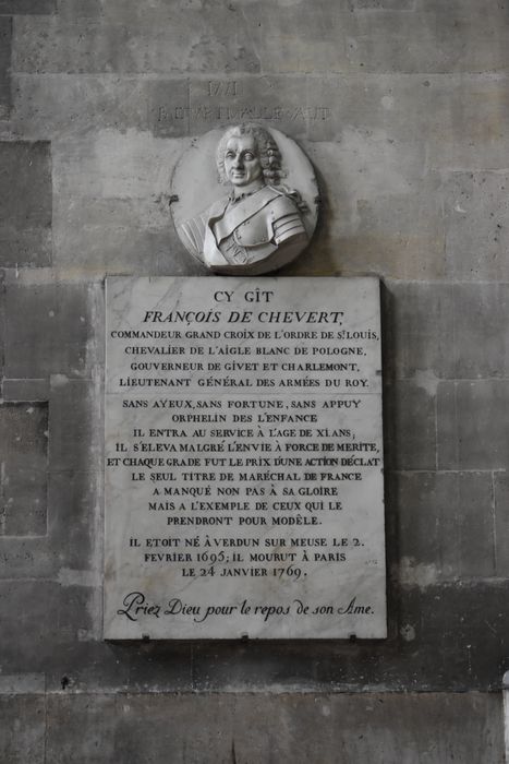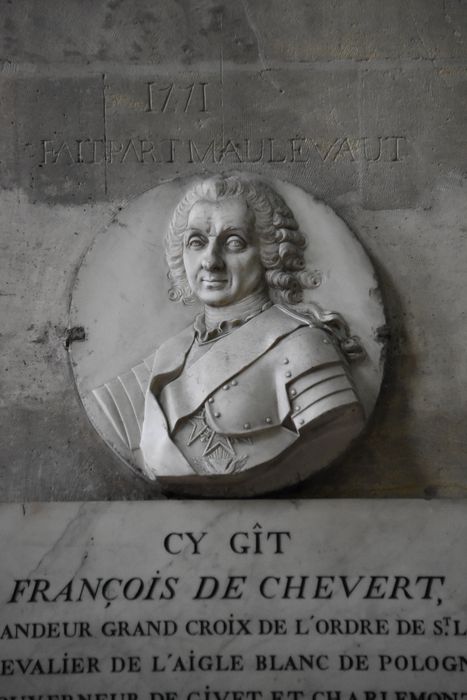 François de Chevert, lieutenant général des armées du Roi, est mort en 1769. Médaillon par Claude-Louis Vassé (1716-1772). L'épitaphe a été composée par d'Alembert. A fait partie du musée des Monuments français, n°402, rendu à l'église sous la Restauration.