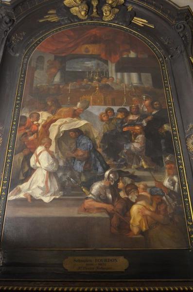 Sébastien Bourdon (Montpellier 1616-Paris 1671). Ancien couvent de la Merci (quartier Sainte-Avoye). Muséum central. Déposé en 1811 à Saint-Germain-l'Auxerrois. Pierre Nolasque, originaire du Languedoc, créa, en 1218, l'ordre de la Merci pour le rachat des captifs. Il fut secondé par Raymond de Penafort, maître général des Frères Prêcheurs, et encouragé par le roi Jacques d'Aragon. Il fut canonisé en 1628. Le couvent de la Merci de Paris fut fondé dès 1613 par Marie de Médicis. Outre le tableau de Bourdon, on y voyait deux statues d'Anguier représentant saint Pierre Nolasque et saint Raymond de Penafort. On sait que Sébastien Bourdon a pratiqué simultanément des genres fort différents, rendant par là difficile l'établissement d'une chronologie de ses oeuvres. On peut toutefois rapprocher le tableau exposé de la Chute de Simon le Magicien (cathédrale de Montpellier), très proche par la composition et le style, et que les documents permettent de situer vers 1660.