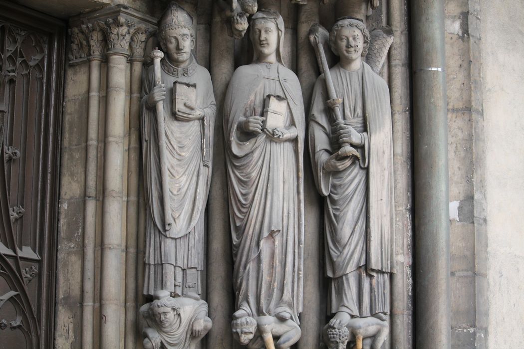 3 statues du porche : Saint Germain, Sainte Geneviève, Un Ange tenant un flambeau