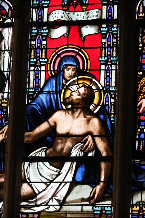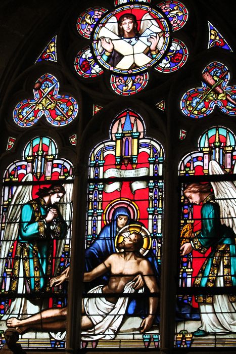 verrière de la chapelle Notre-Dame-de-la-Compassion : La Vierge de Pitié entre deux anges