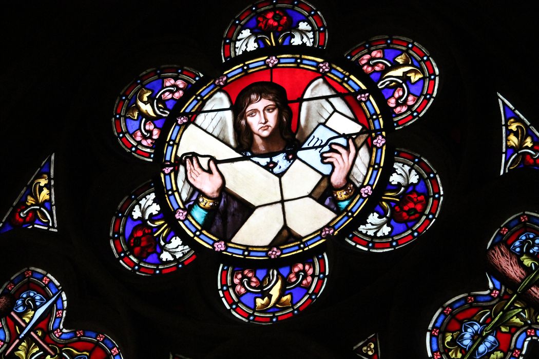 POP | Plateforme ouverte du patrimoineverrière de la chapelle Notre-Dame-de-la-Compassion : La Vierge de Pitié entre deux anges