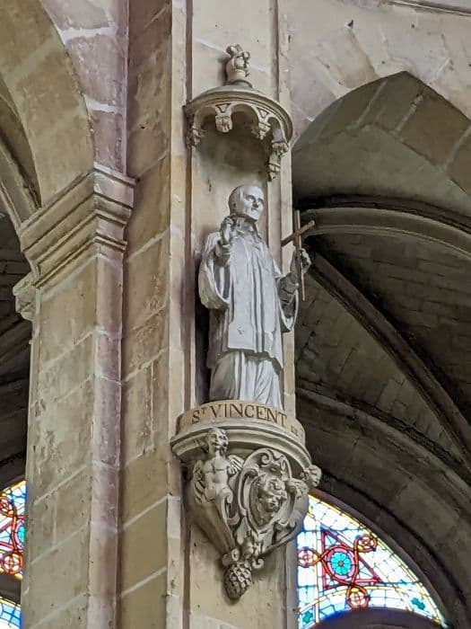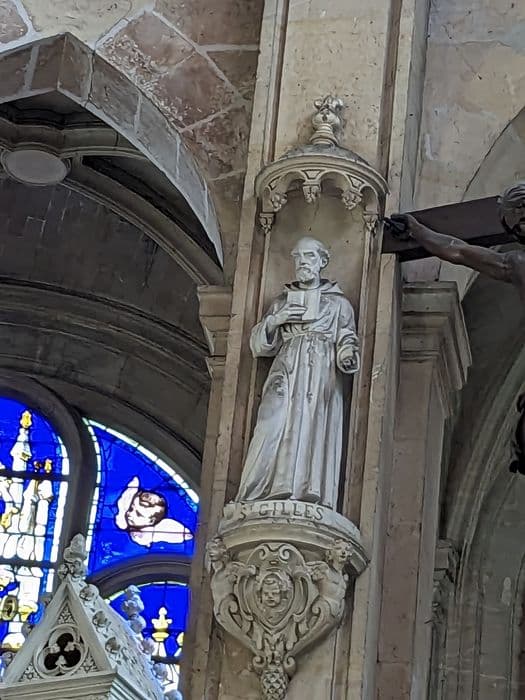 9 statues en plâtre des piliers du choeur et du sanctuaire : Saint Chrysostôme, Saint Vincent, Saint Pierre, Saint Gilles, Le Christ, Saint Joseph, Saint Paul, Saint Charles, Saint Augustin