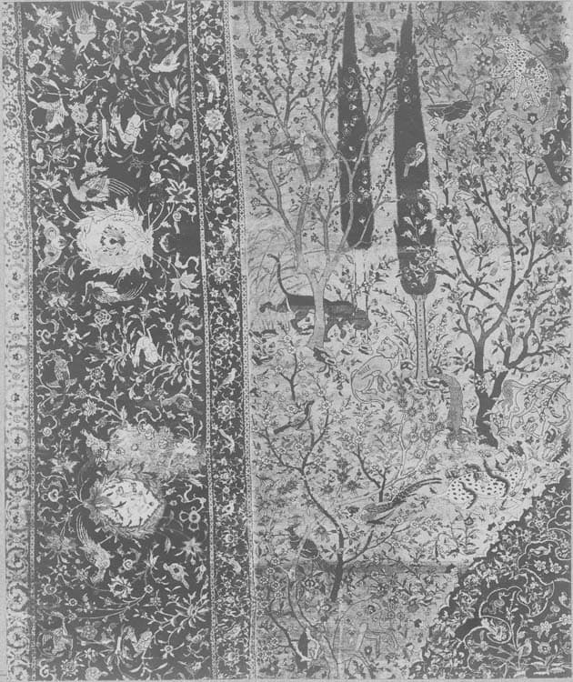 Moitié d'un tapis perse. Au centre, sur fond jaune, un grand médaillon que prolongent deux autres plus petits. Le grand à fond rouge et bordure noire, renferme un semis de fleurs et d'oiseaux ; le second, noir, des fleurs ; le troisième, rouge, des palmettes, fleurs et oiseaux. Sur le fond jaune, quatre cyprès verts et des arbres fleuris à troncs orange et beige, entre lesquels sont figurés des dragons, des lièvres, des cerfs et des léopards ; sur les branches des oiseaux ; les arbres et les animaux sont au naturel ; les dragons sont blancs, roses et bleus. Bordure composée de trois bandes, l'une très large à fond rouge avec palmettes au milieu de rinceaux et d'animaux, une étroite, noire avec fleurs et oiseaux, la dernière, également étroite, verte avec rinceaux jaunes.