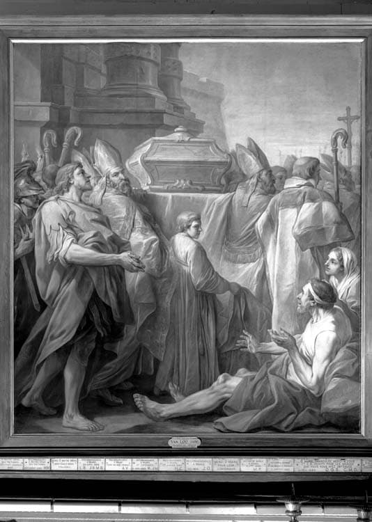 ensemble de 7 tableaux : Scènes de la vie de saint Augustin, Louis XIII dédiant l'église Notre-Dame des Victoires à la Vierge