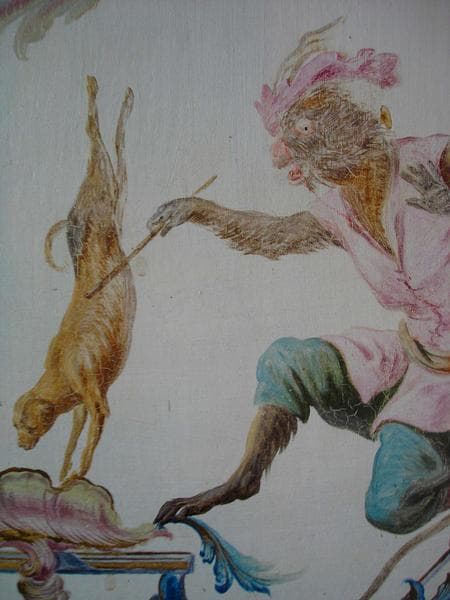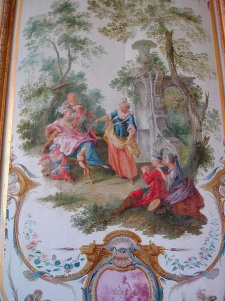 Grand cabinet décoré de peintures par Christophe Huet, un des panneaux autrefois peint sur une porte a été remplacé par une peinture de Galland. Ancien oratoire composé de 6 grands panneaux (et 1 moderne refait) et 6 petits panneaux.