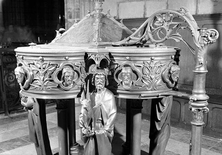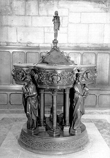 Statuette d'environ 40 cm de haut en ronde-bosse en bronze représentant saint Jean-Baptiste bénissant, vêtu de la tunique de peau. Créé par Louis Bachelet et réalisé par Louis Vuilleinot d’après un dessin de Viollet-le-Duc pour le couvercle des fonts baptismaux sur lequel il a été dérobé. Il était fixé sur un chapiteau qui a été retrouvé désolidarisé du couvercle et mis à l’abri.