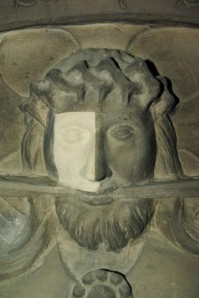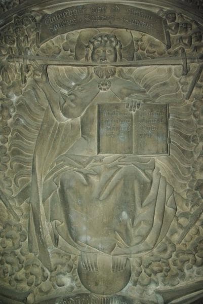 A effigie gravée. On voit en bas le cadavre rongé par les vers ; au-dessus le chanoine sort de son tombeau et paraît, assisté de saint Etienne et de saint Jean devant le Christ-Juge, assis dans une auréole, entouré d'anges, et bénissant. Dans la main gauche, il tient le livre de la vie ; deux épées se croisent sur ses lèvres. De nombreuses inscriptions latines de déroulent sur des phylactères.