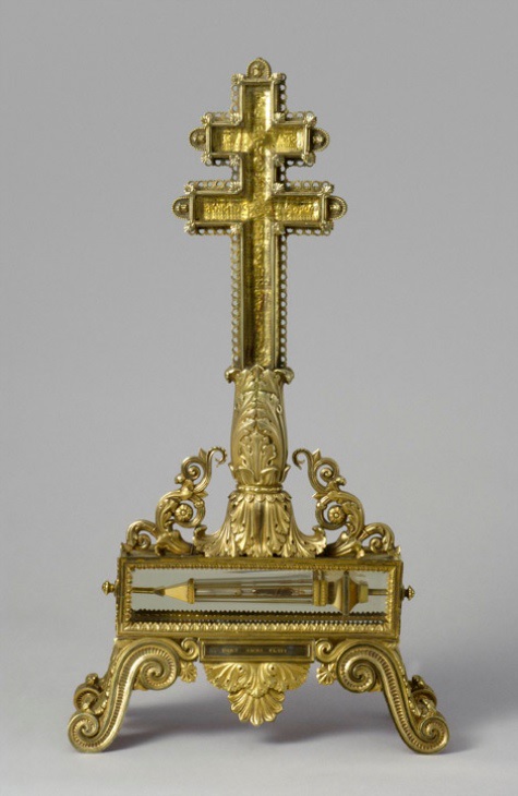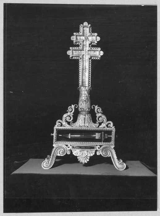 Dans le socle : Vera Crux dicta Palatina. Au revers : Pars Sacri Clavi. En-dessous : Ex munificentia Illust,mi et Reverend,mi in Christo Patris D.D. Hyacinthi Ludovoci de Quelen Archiep,i Parisiensis Aq,r L. Lusson architec,ii Inv,it P. Quentin Can,us Direx,t J.P.FAMECHON.AURIFEX.FECIT