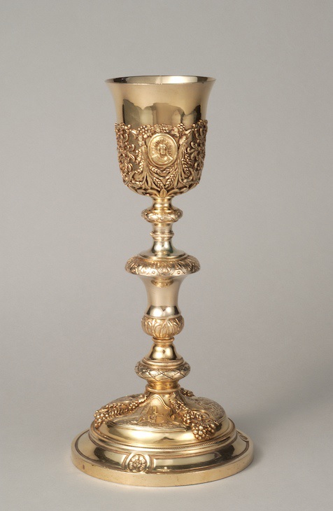Trésor n°50. Pied rond ; frise ; grappes et fruits ; trois scènes, Christ au jardin des Oliviers, Chute du Christ sous le poids de la croix et Calvaire. Haute tige ; noeud balustre. Fausse coupe repercée ; trois médaillons (Christ, Vierge, Marie-Madeleine). Patène avec couronne d'épines, IHS, croix et coeur avec trois clous.